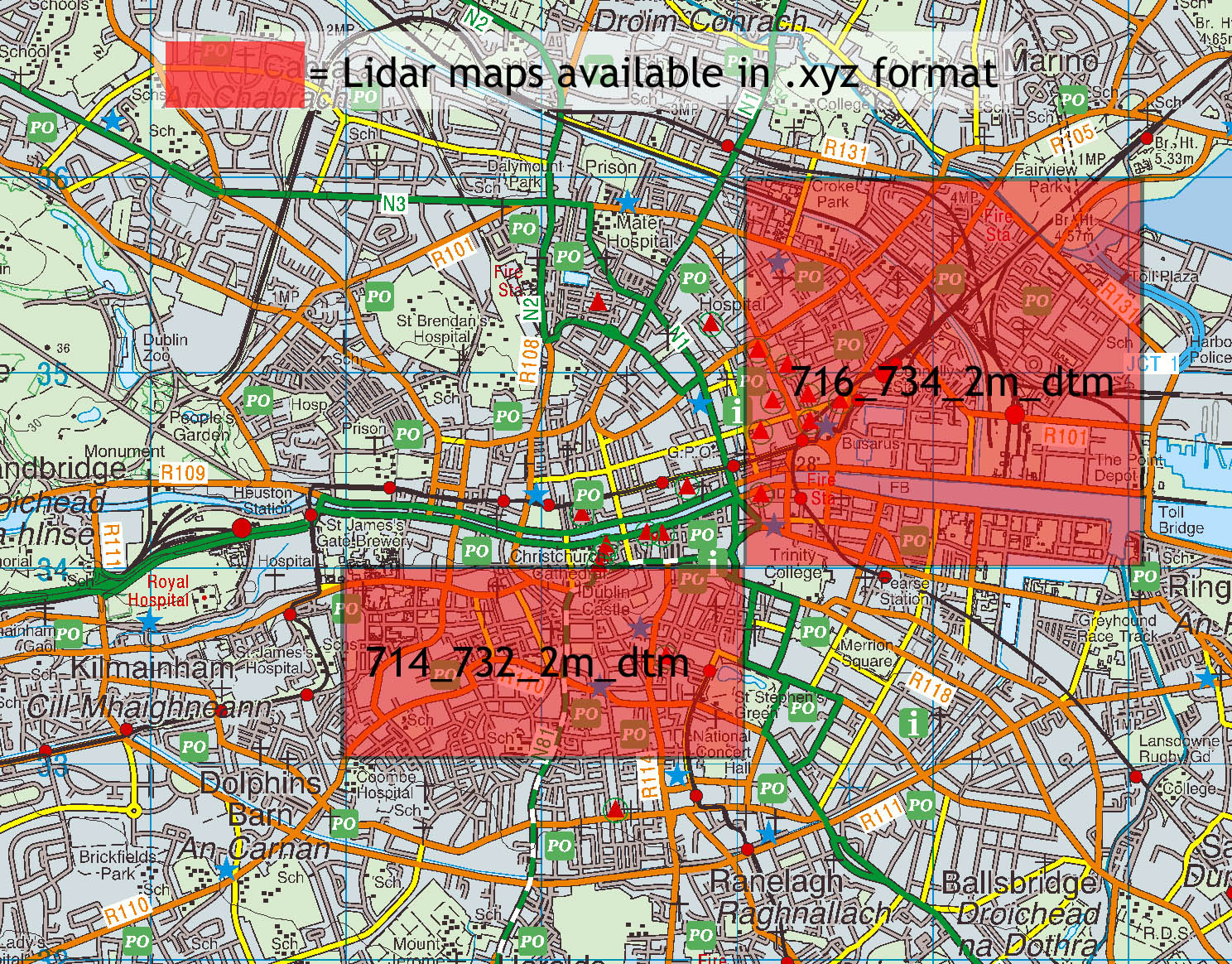 The Lidar data comes in two maps, featuring selected areas of Dublin. The areas can be viewed on this Lidar map.